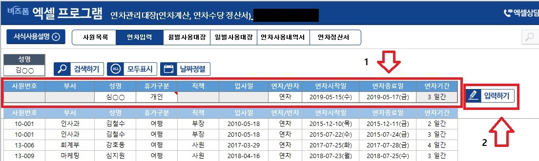 ¾Æ·¡ »çÁøÀ» Âü°íÇÏ½Ã¸é »¡°£»öÀ¸·Î üũµÇ¾îÀÖ´Â ºÎºÐ¿¡ ¿¬Â÷¸¦ »ç¿ëÇÑ Á÷¿øÀ» ¼±ÅÃÇÏ¿© ³¯Â¥¿Í ¿¬Â÷»ç¿ë Á¤º¸¸¦ ÀÔ·ÂÇϽŠÈÄ 'ÀÔ·ÂÇϱâ'¹öưÀ» ´·¯