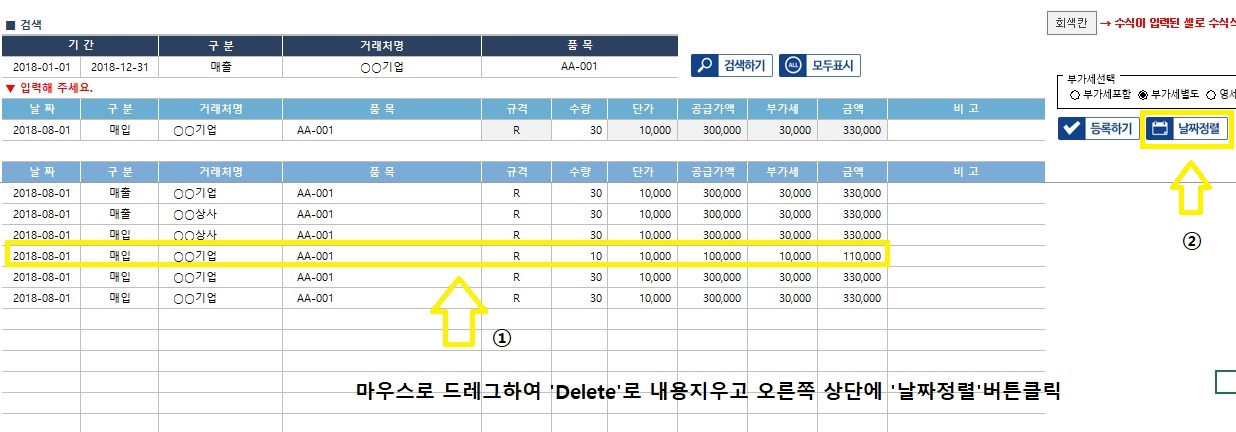 ¼öÁ¤ÀÌ µÇ¾î¾ß ÇÒ ºÎºÐÀ» ´Ù½Ã ÀçÀÔ·ÂÇϽŠÈÄ¿¡ ¿À¸¥ÂÊ »ó´Ü '³¯Â¥Á¤·Ä'¹öưÀ» ´©¸£½Ã¸é µË´Ï´Ù.