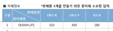 ¿ÏÁ¦Ç° "OR3-k" 1°³¸¦ ¸¸µé¶§ ¿øÀÚÀç "S6304YLJFS"°¡ 320°³°¡ ¼Ò¿äµÈ´Ù°í µÇ¾îÀÖ½À´Ï´Ù.
