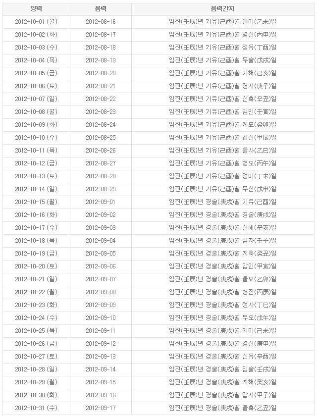 ¾Æ·¡¿Í °°ÀÌ 2012³â 10¿ù À½·Â°£Áö¸¦ ¾È³»ÇØ µå¸³´Ï´Ù.